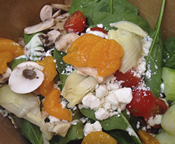 cucumber, mushroom, sun flower seeds, crasins, slivered almonds, croutons, sautéed onions-peppers,