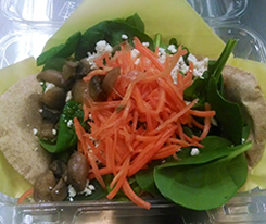whole wheat flat bread, brown rice, spinach, mixed greens, cabbage slaw, romaine